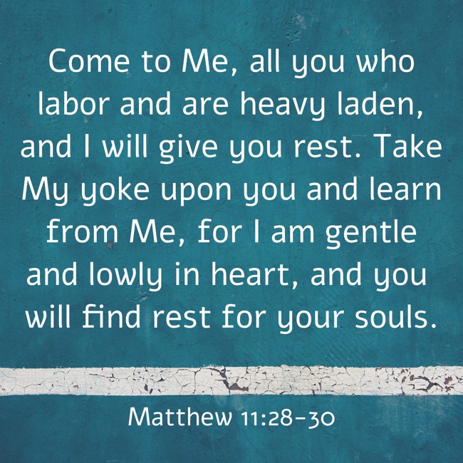 Come to Me, all you who labor and are heavy laden, and I will give you rest. Take My yoke upon you and learn from Me, for I am gentle and lowly in heart, and you will find rest for your souls.